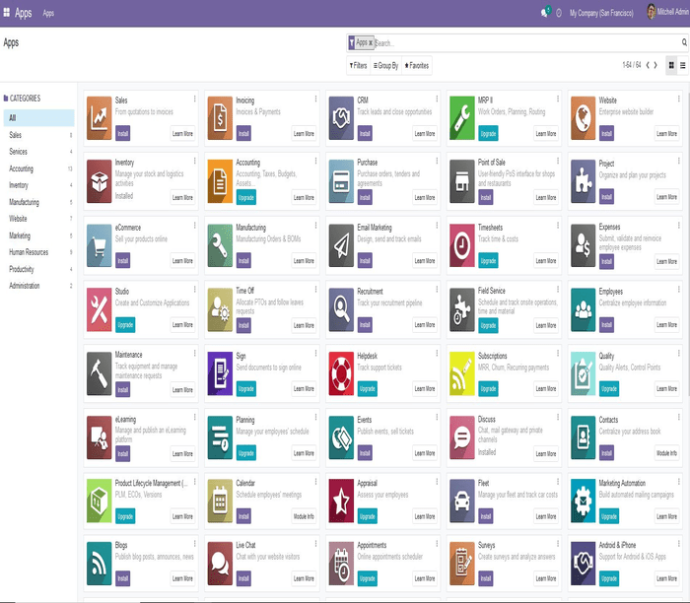 Ya iniciada la sesión y desde la ventana de las apps de Odoo, podrás instalar las diferentes aplicaciones y probarlas.
